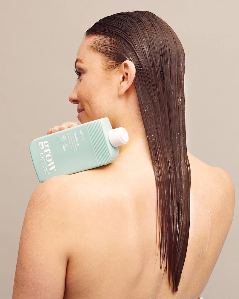 Après avoir lavé vos cheveux avec le shampoing Grow Perfect™, répartissez l'après-shampoing Grow Perfect™ sur vos cheveux humides, en insistant sur les mi-longueurs et les pointes. Laissez agir pendant 2 à 3 minutes, puis rincez vos cheveux.